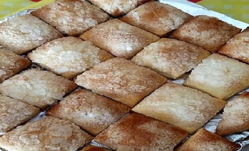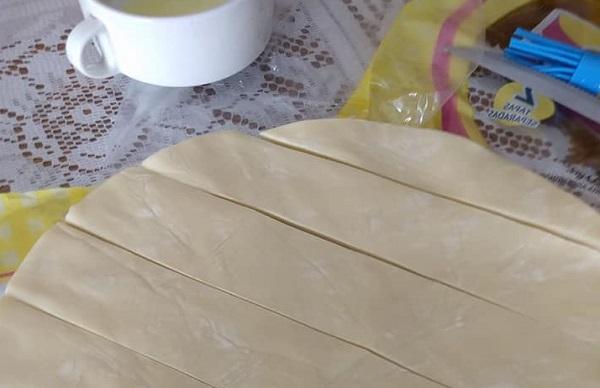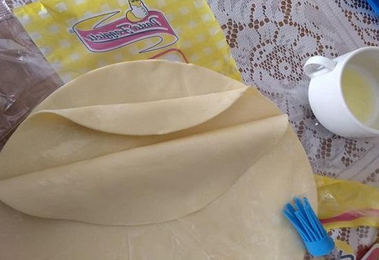 Colocar en una asadera papel manteca, untarlo con rocío vegetal y acomodar encima uno de los discos. Untarlo con clara de huevo. Agregar encima otro disco, untarlo con clara de huevo. Agregar el tercer disco. Cortar en tiras, como en las fotos, girar y volver a cortar. Se pueden cortar en forma cuadrada o triangular.