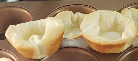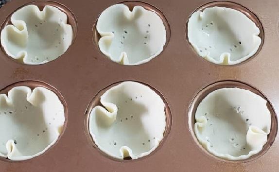 Encender el horno. Humedecer con rocío vegetal el molde para muffins. Hincar los discos con un tenedor y acomodarlos en el molde formando canastitas. Llevar a horno medio 10 minutos. Reservar.
