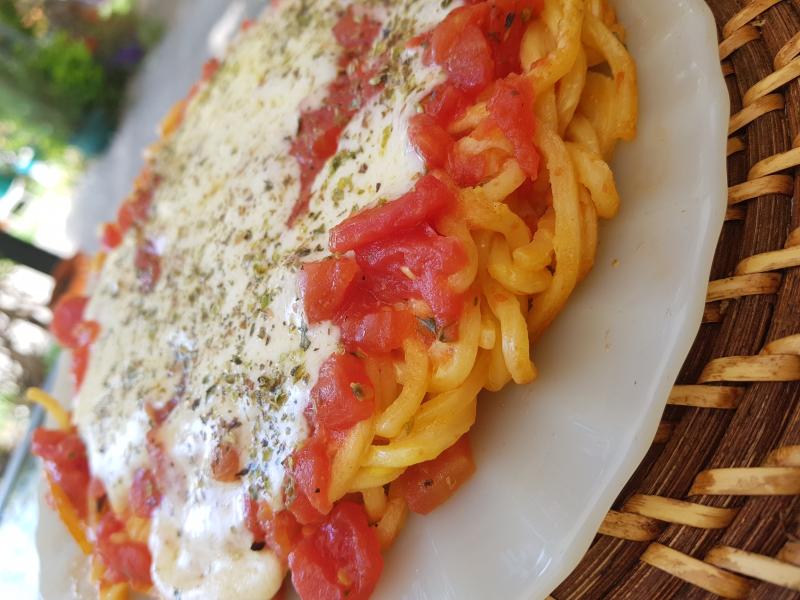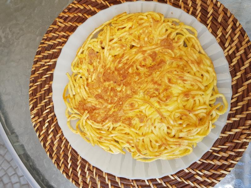 Suave y sabrosa pizza de tallarines.
