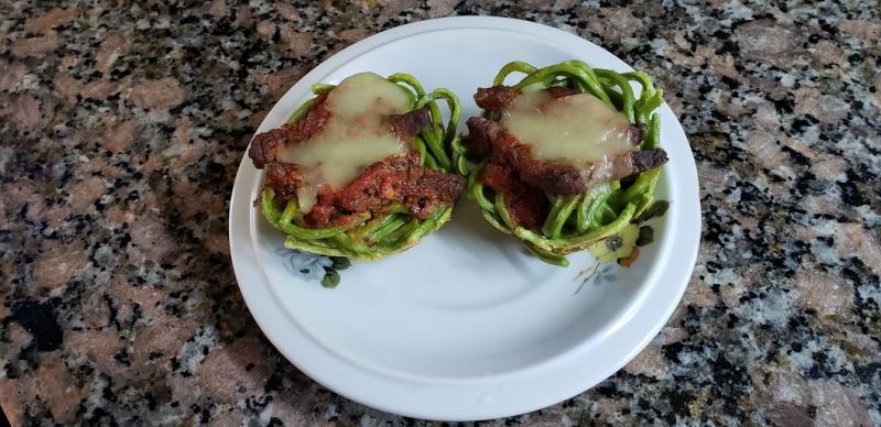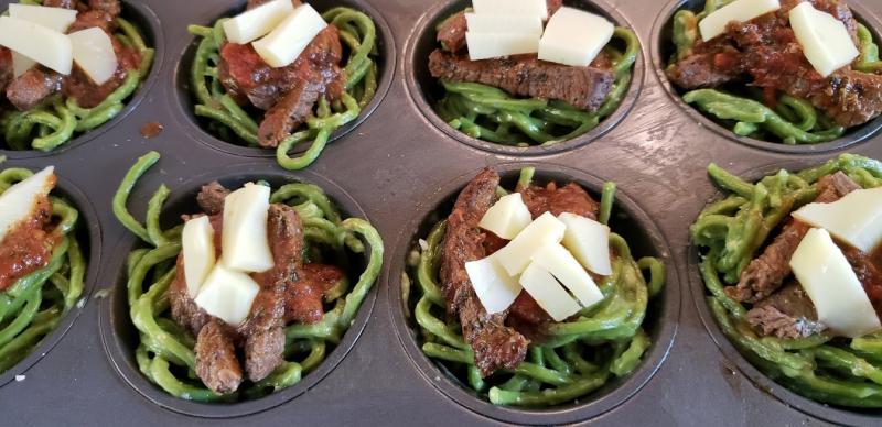 Rociar con rocío vegetal un molde para muffins, colocar, con la ayuda de un tenedor, los fideos formando un pequeño nido; luego agregar una cucharada del preparado de carne y tomates y colocar encima un trozo de queso muzzarella (o cremoso). Llevar a horno medio hasta que se derrita el queso y tome color.